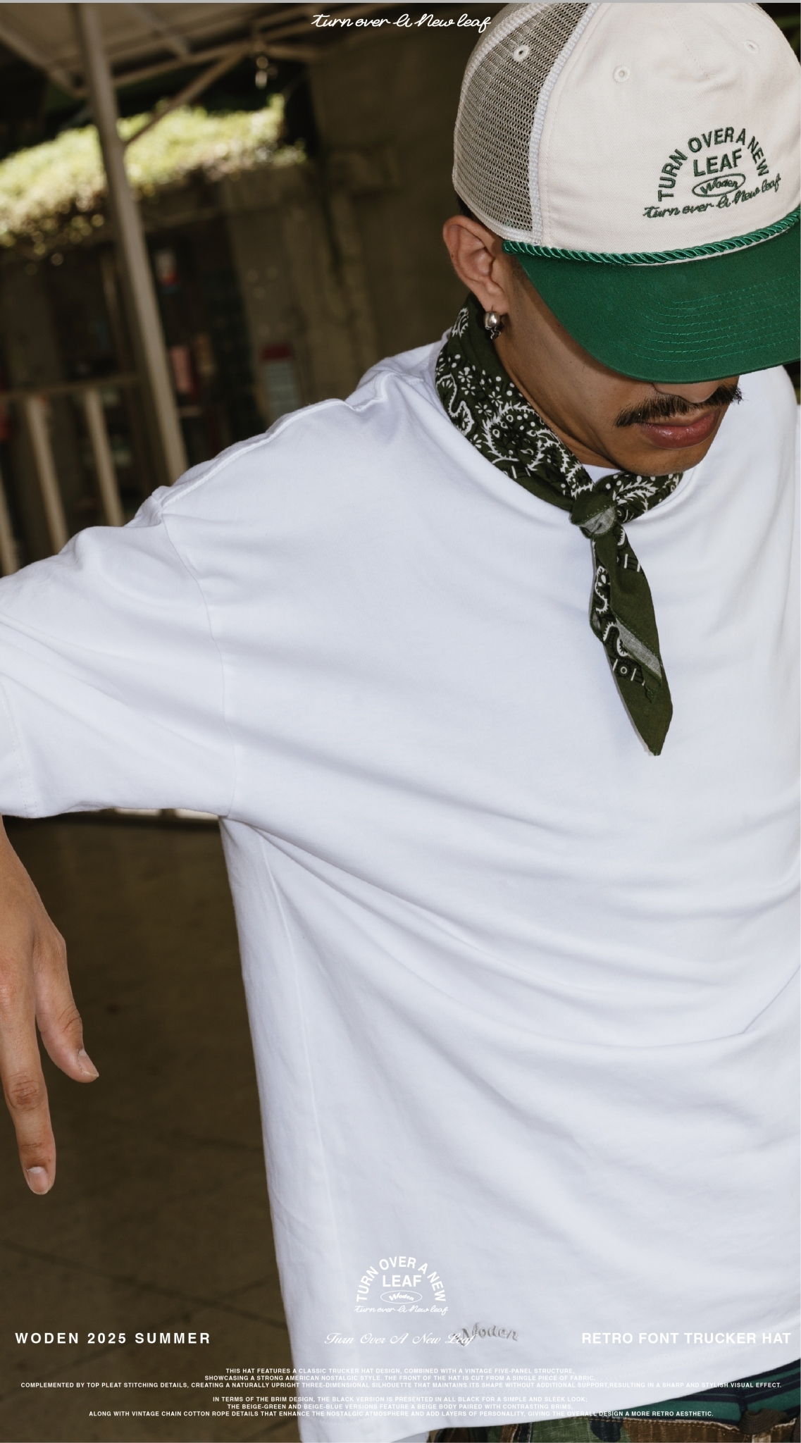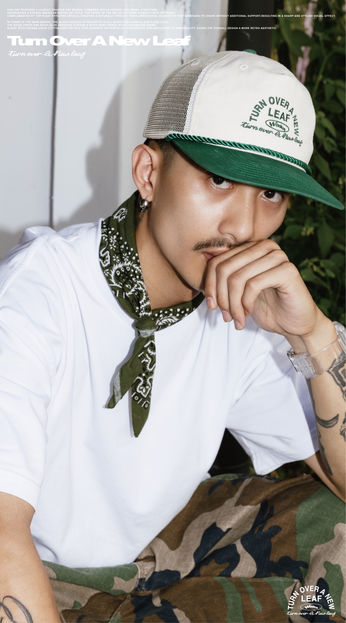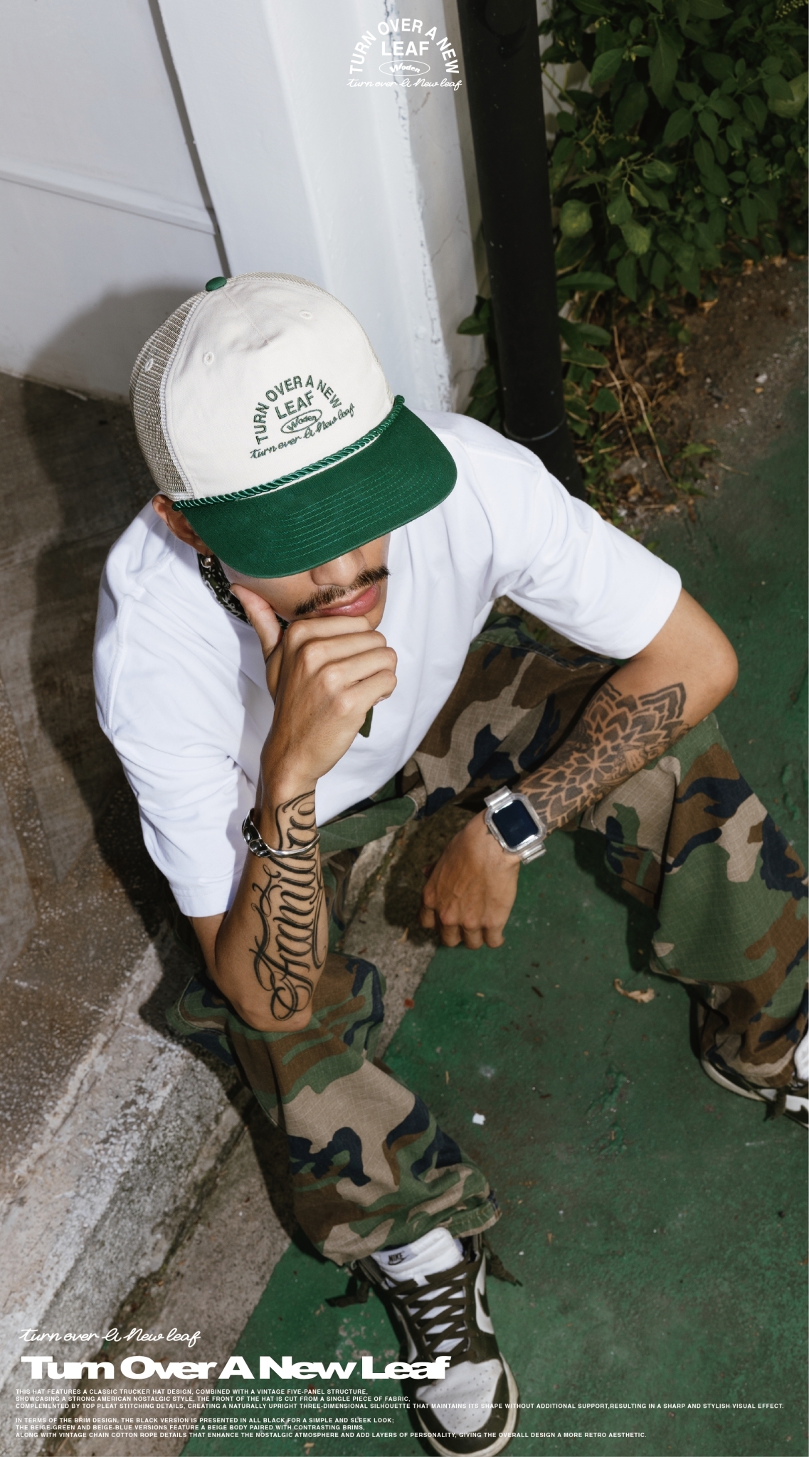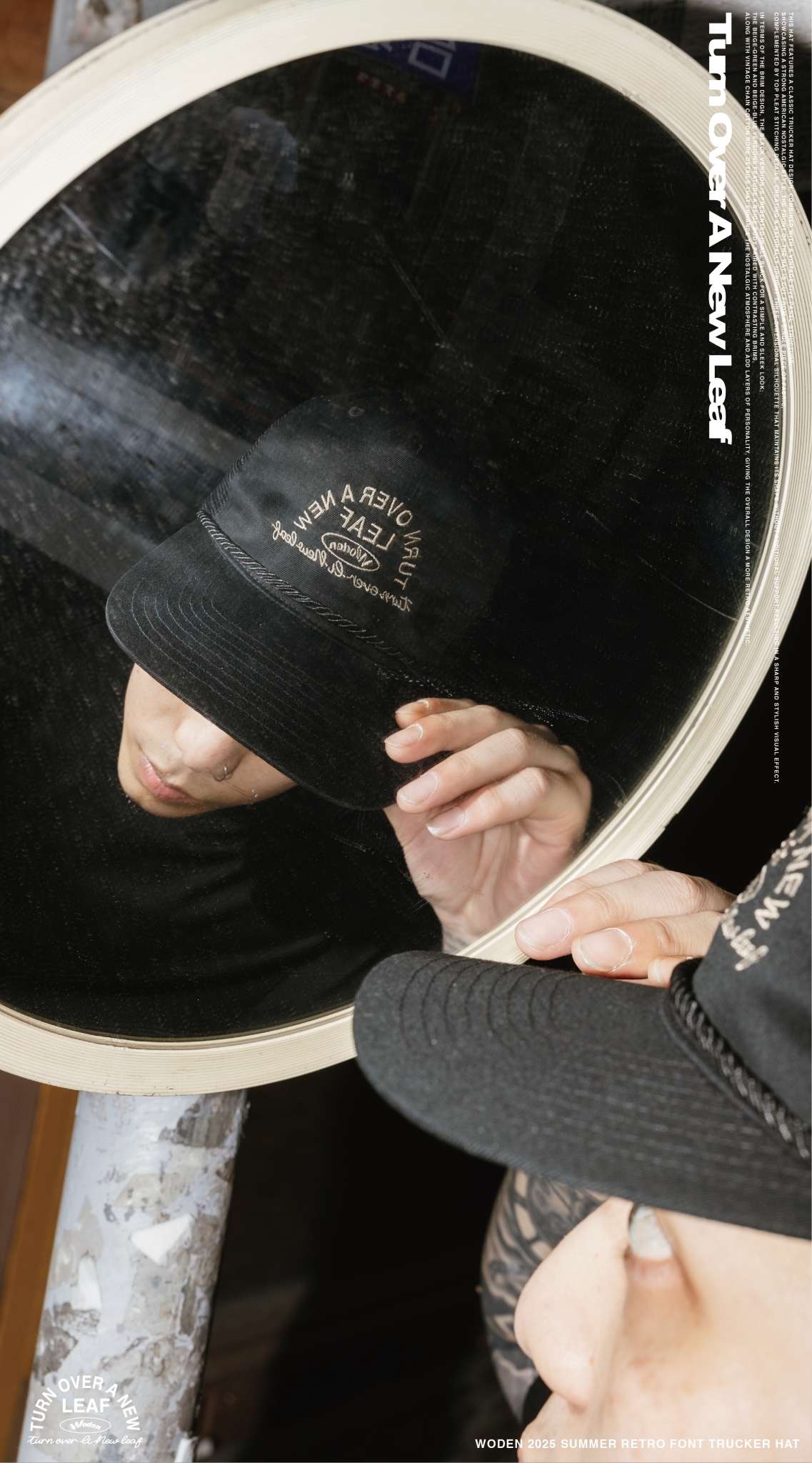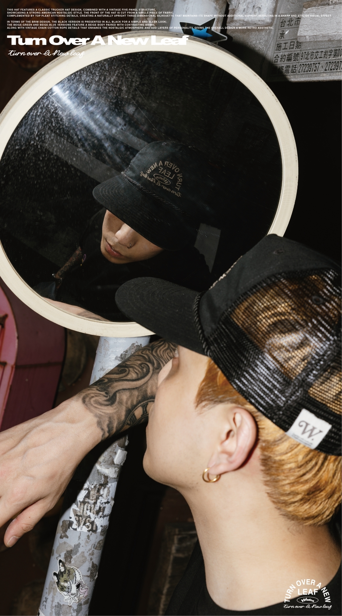 正面刺繡字樣「TURN OVER A NEW LEAF」,寓意翻開新篇章、迎接嶄新生活,傳達低調卻充滿態度的品牌精神。背面縫製復古米色紡棉標籤,細節之中體現對帽款質感與識別度的講究。