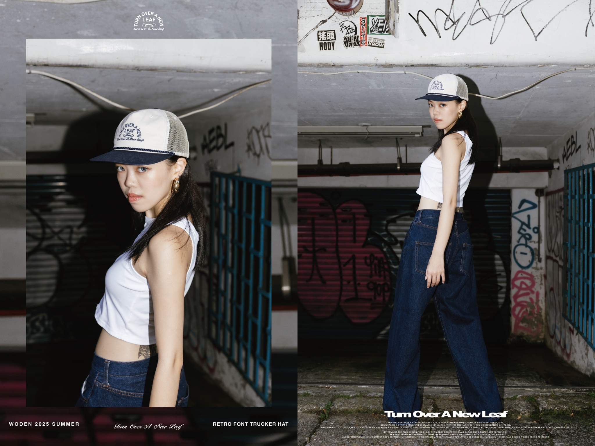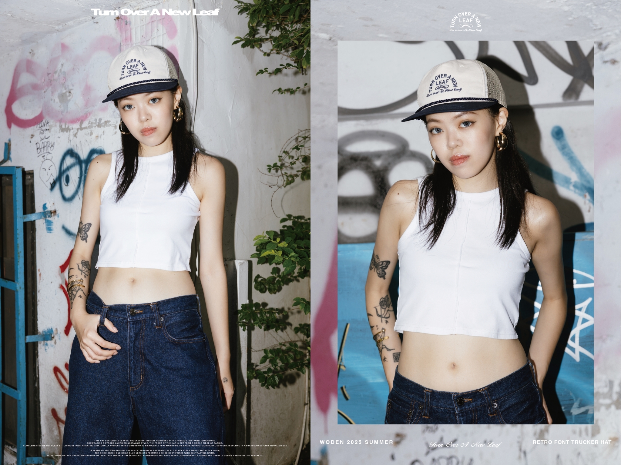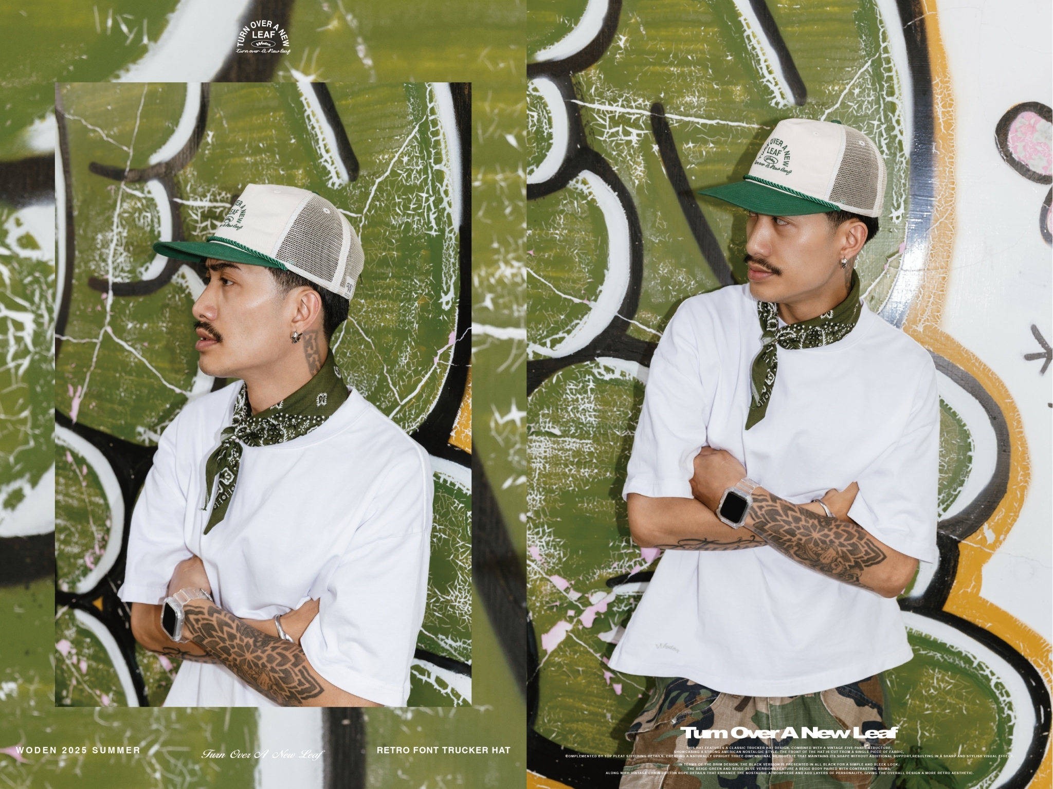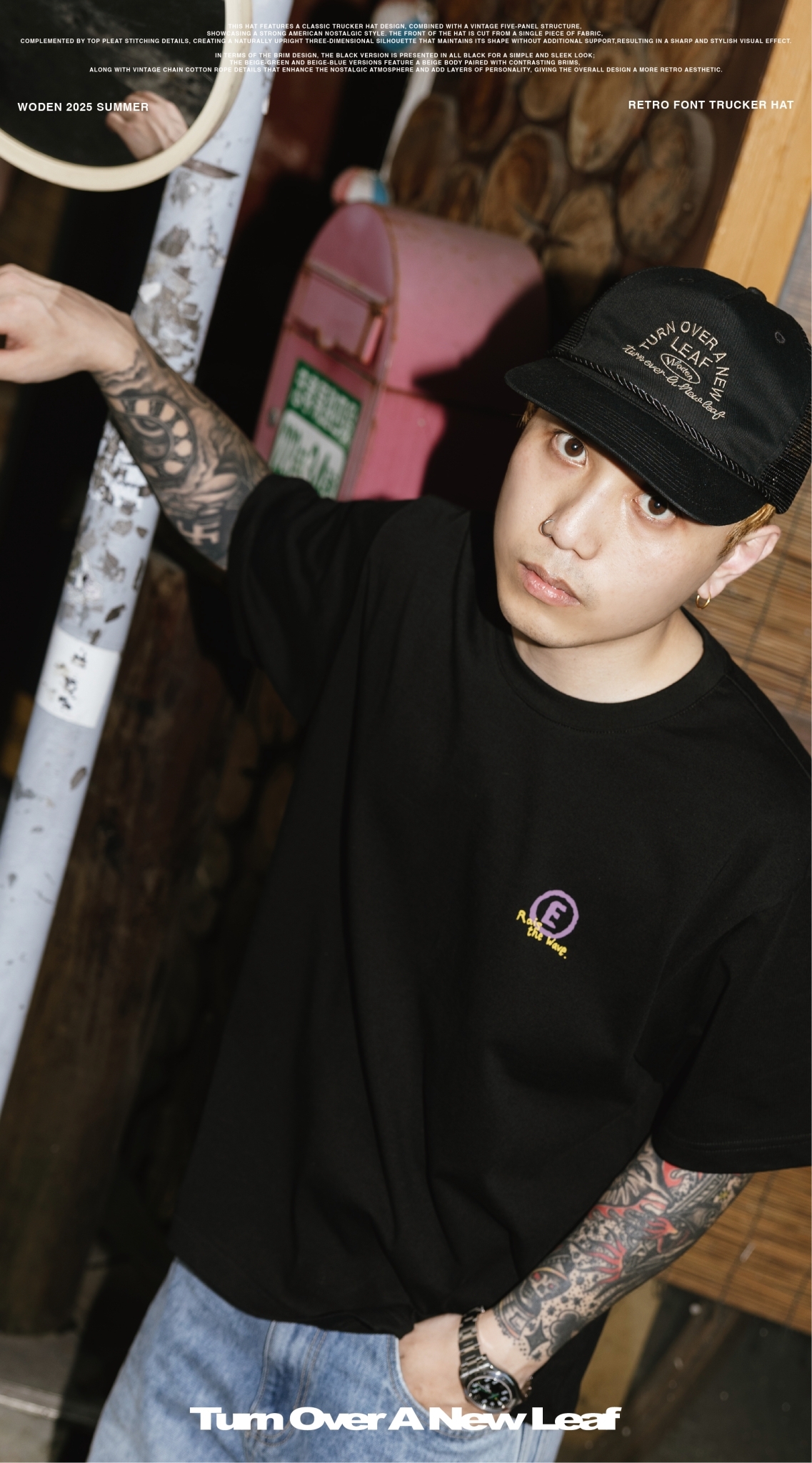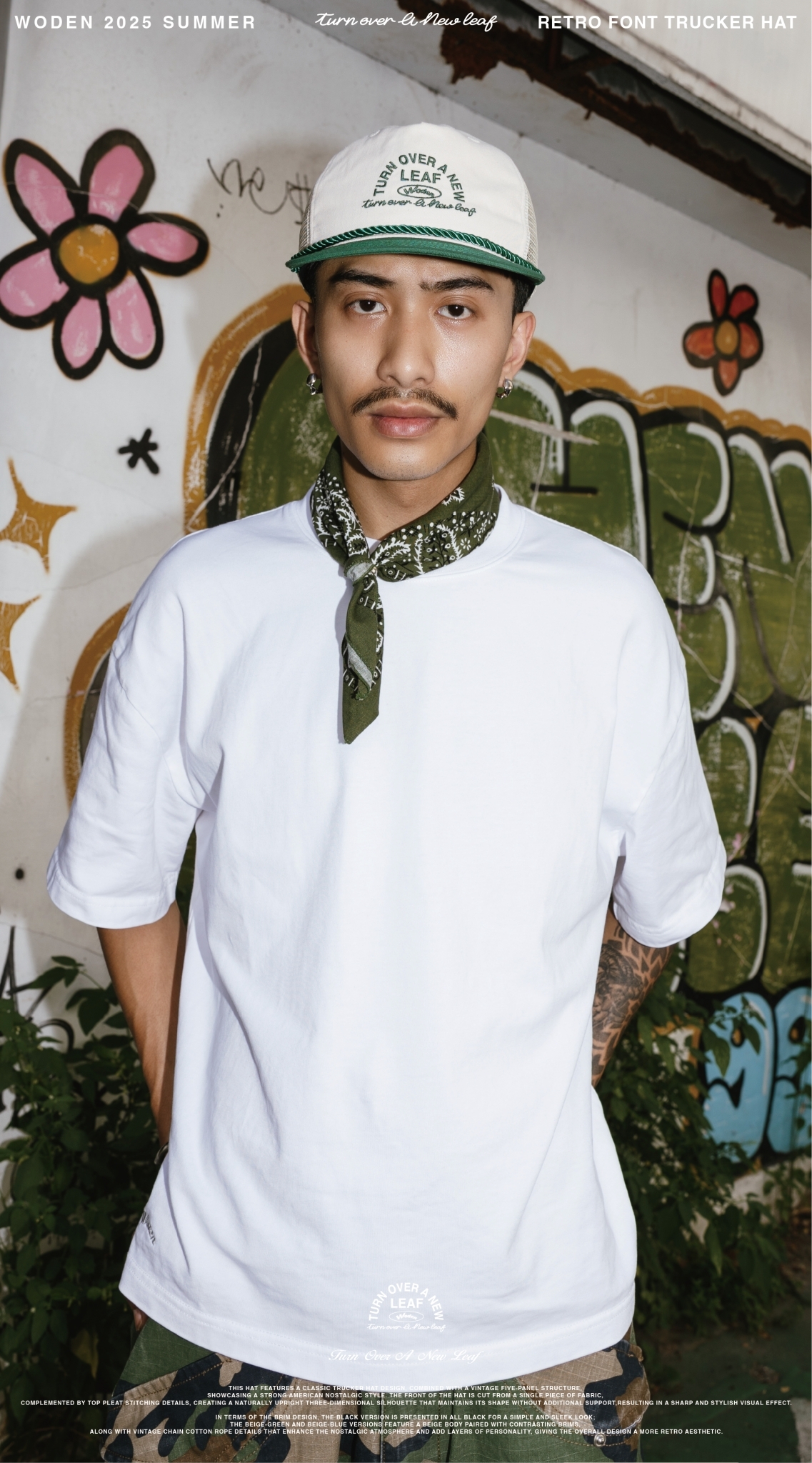 正面刺繡字樣「TURN OVER A NEW LEAF」,寓意翻開新篇章、迎接嶄新生活,傳達低調卻充滿態度的品牌精神。背面縫製復古米色紡棉標籤,細節之中體現對帽款質感與識別度的講究。