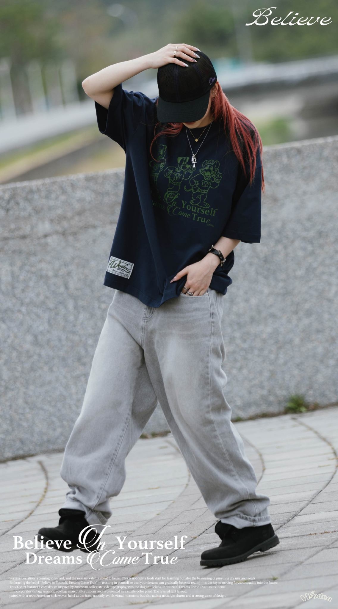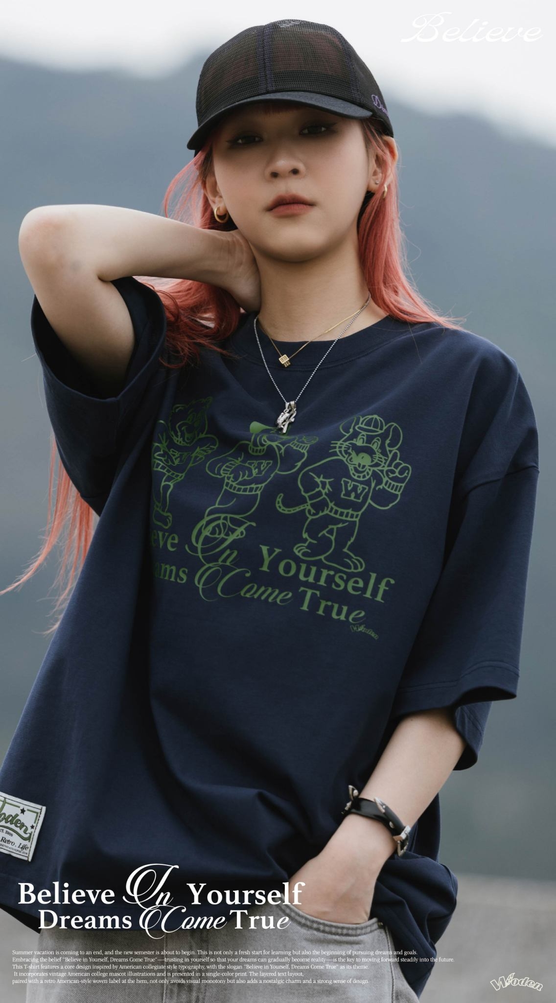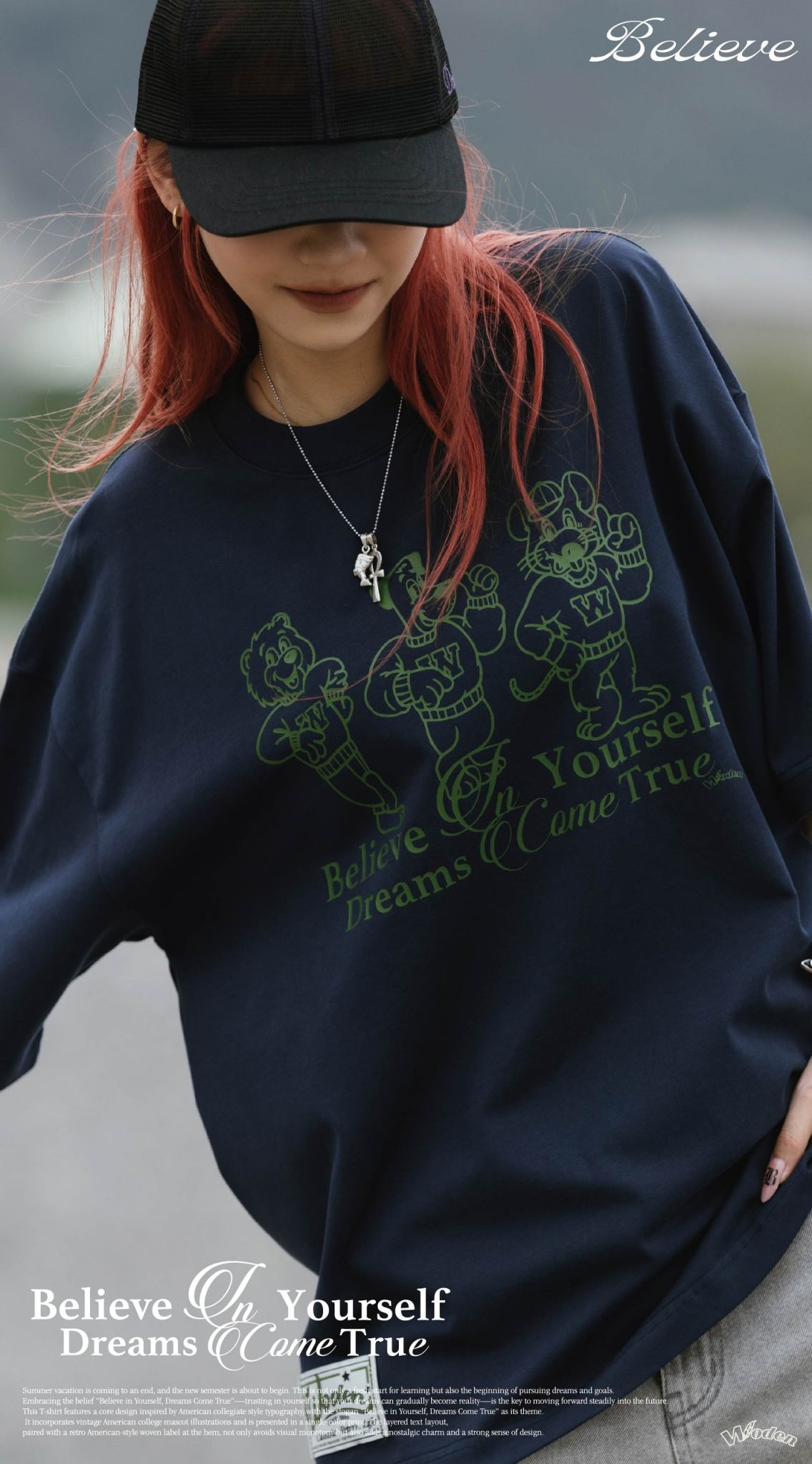 本次 T-shirt 以美式學院風排版為核心設計,將標語 「Believe in Yourself , Dreams Come True」 作為主題,融入復古美式學院吉祥物插畫,並以單色印花呈現,層次分明的文字編排,搭配下擺美式風格復古織標,不僅避免了視覺單調,還增添了復古韻味與設計感。