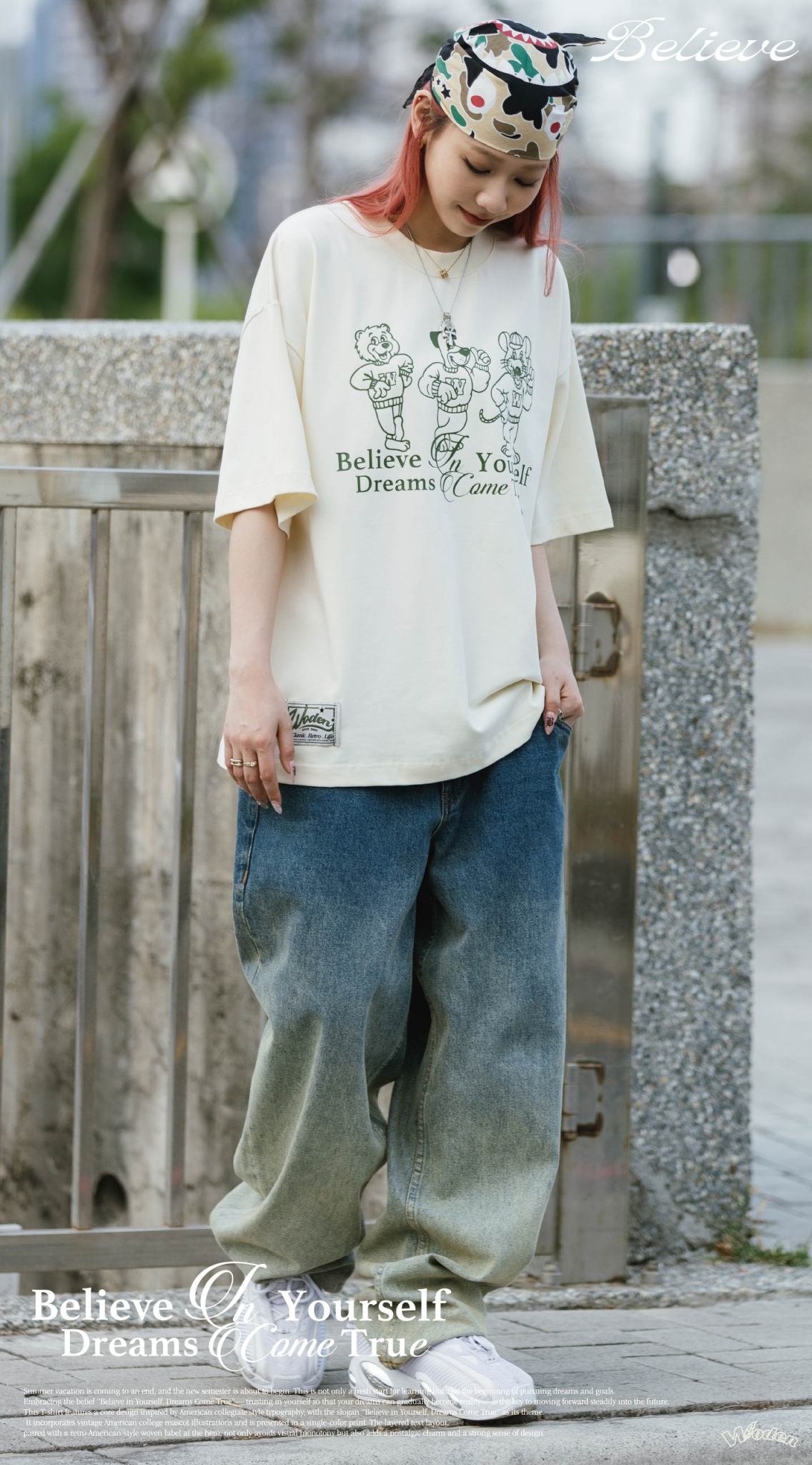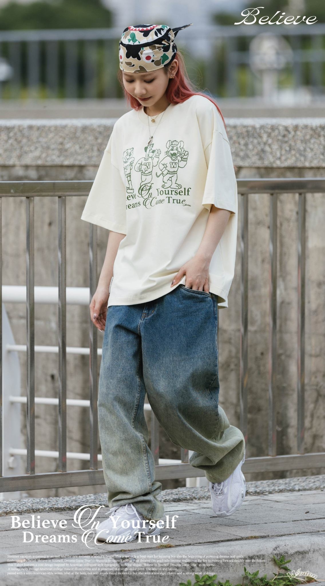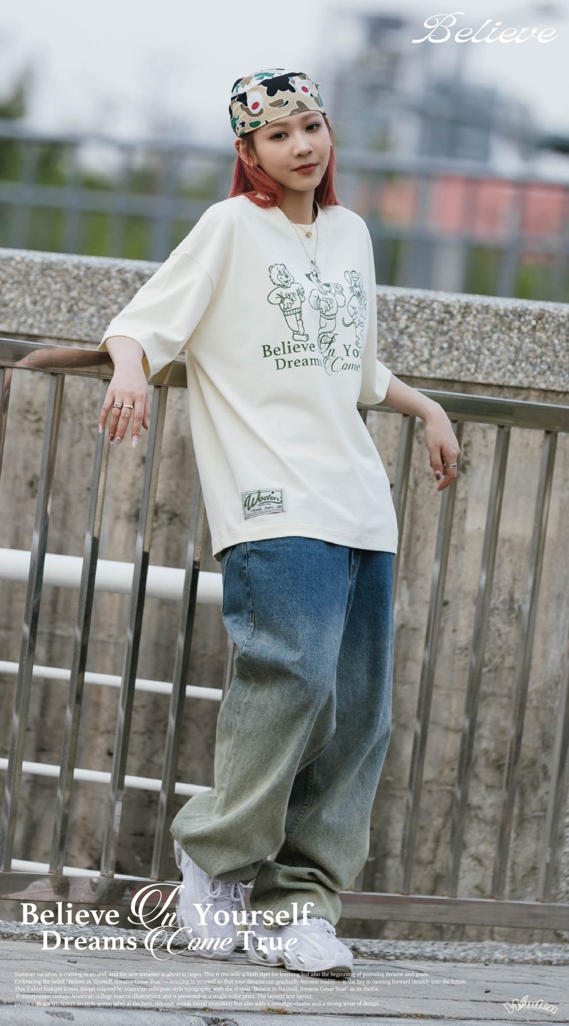 本次 T-shirt 以美式學院風排版為核心設計,將標語 「Believe in Yourself , Dreams Come True」 作為主題,融入復古美式學院吉祥物插畫,並以單色印花呈現,層次分明的文字編排,搭配下擺美式風格復古織標,不僅避免了視覺單調,還增添了復古韻味與設計感。