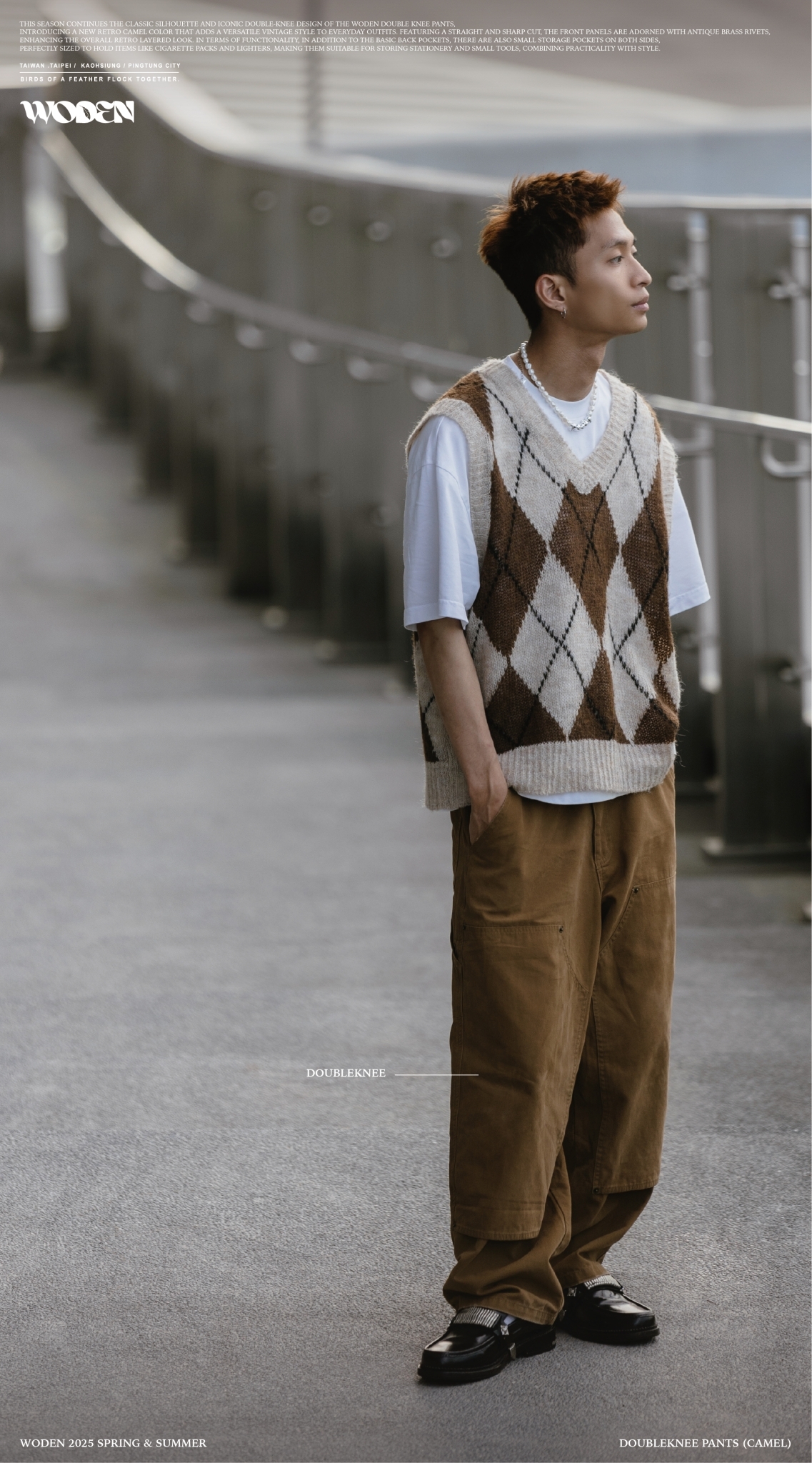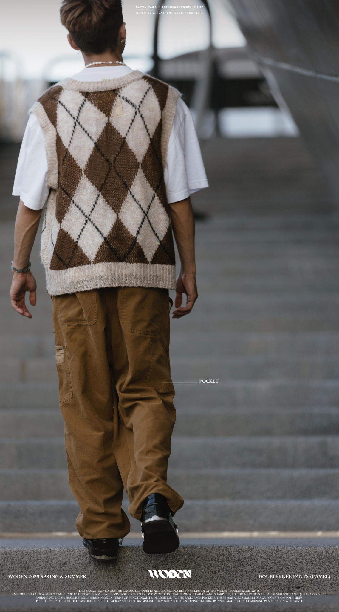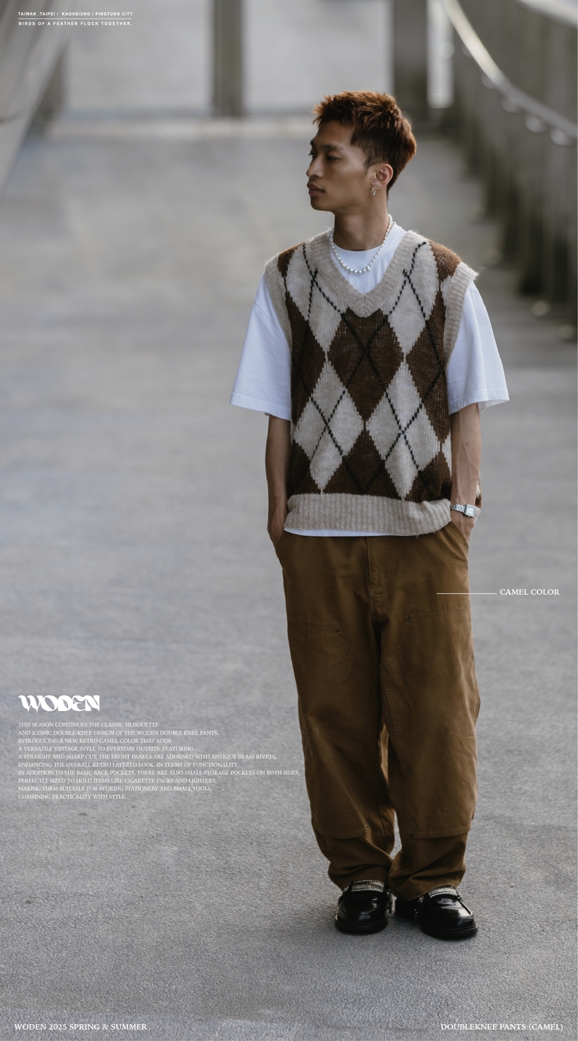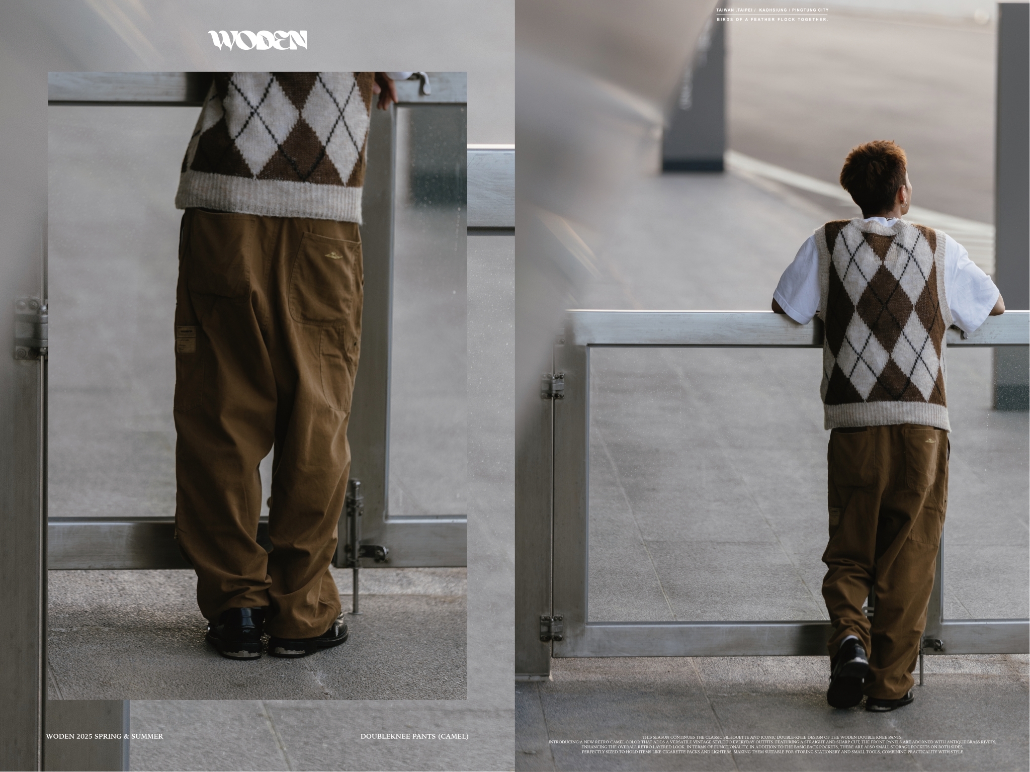 本季延續 WODEN Double Knee Pants 的經典版型與標誌性雙膝裁片設計,推出全新復古駝色配色,為日常穿搭注入百搭復古風格。採用筆直俐落的直筒褲版型,正面裁片加上古銅色鉚釘點綴細節,整體更添復古層次感。機能性方面,後側除基本臀部口袋外,兩側另增設小型收納口袋,尺寸剛好可容納菸盒、打火機等隨身物品,亦適合收納文具與小型工具,兼具實用與風格。