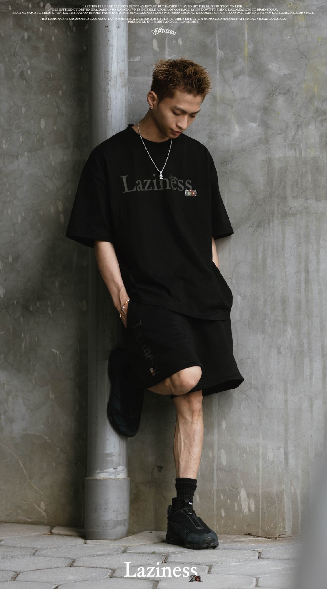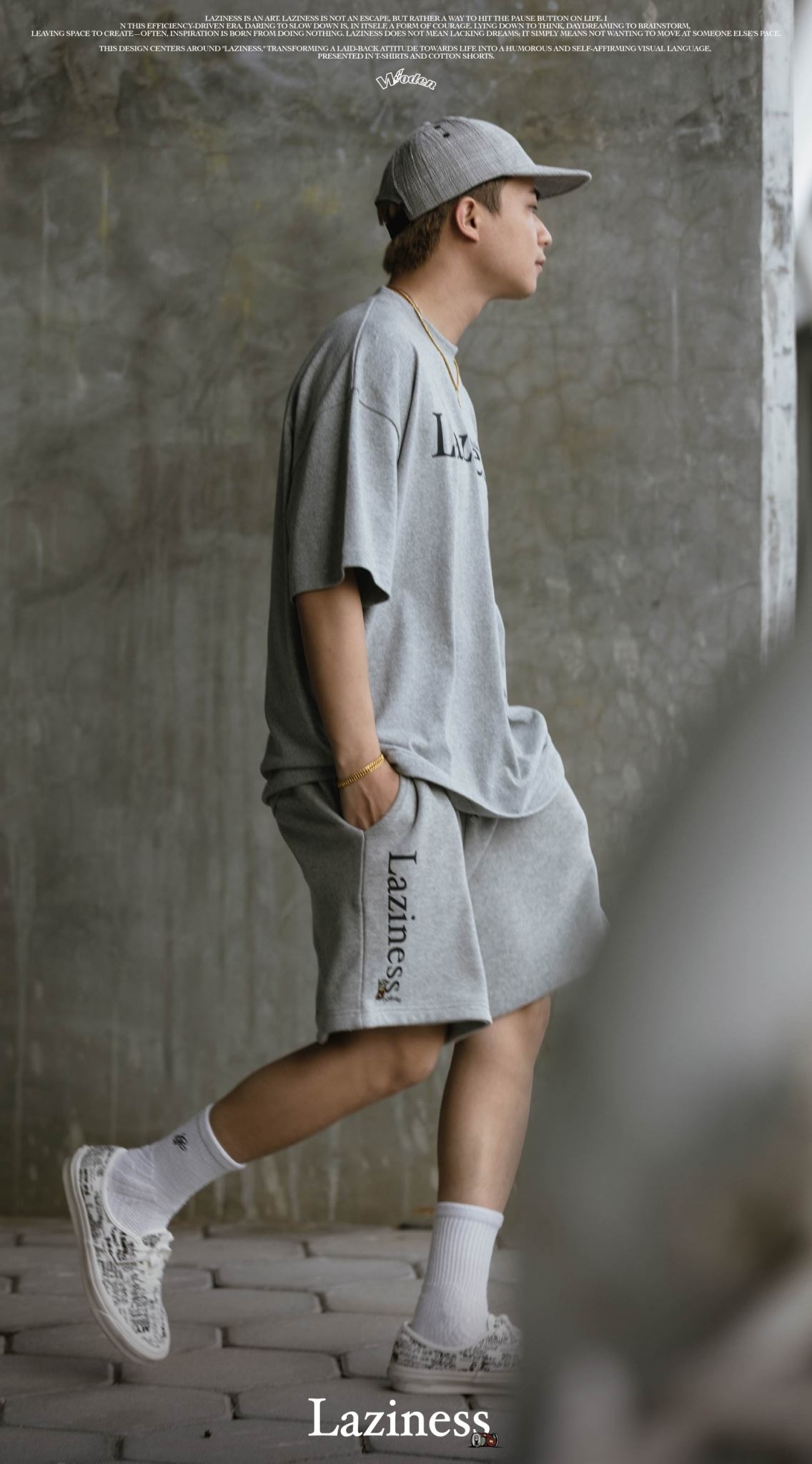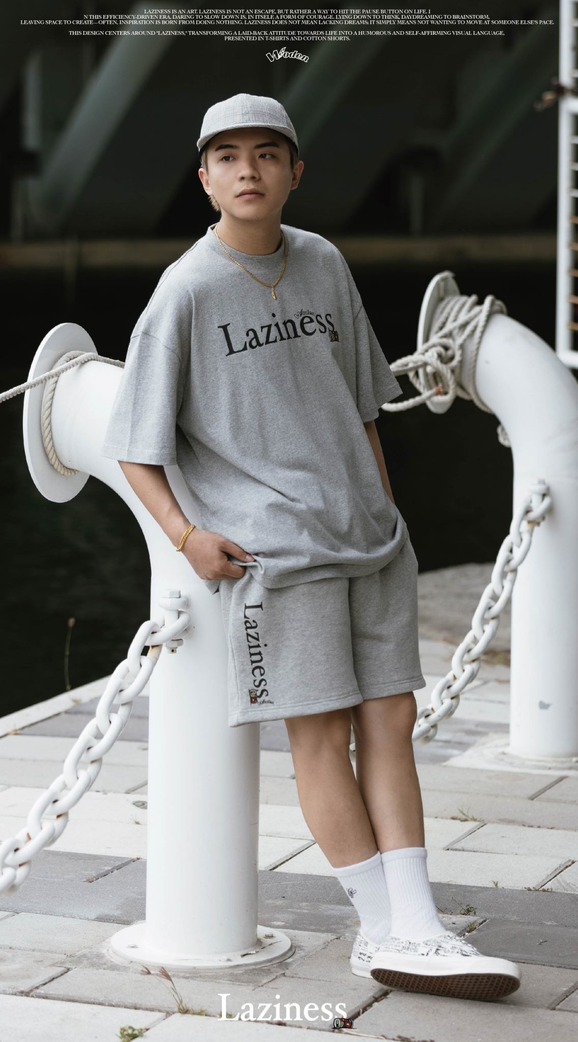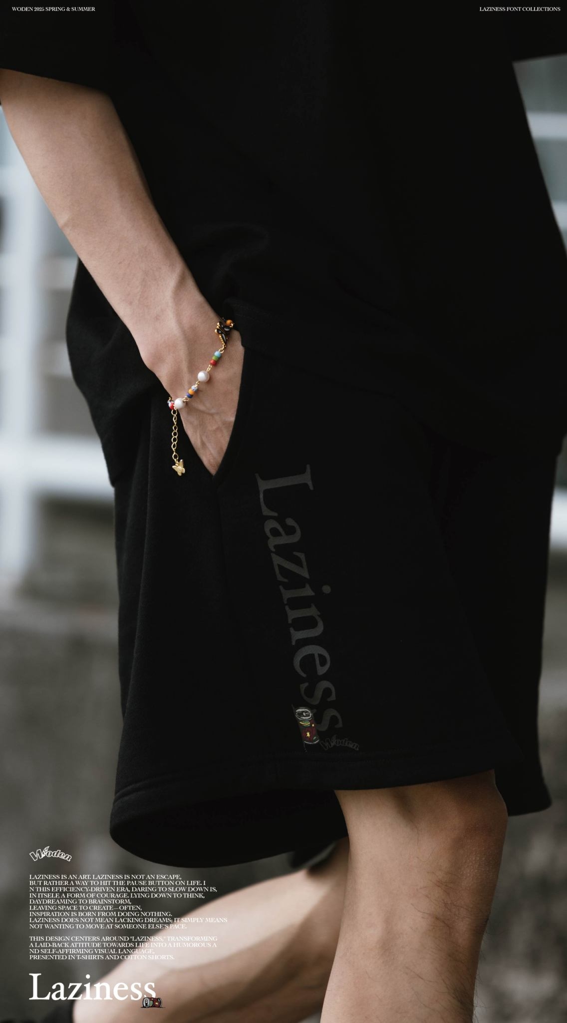 本次設計以「Laziness」為核心,將懶散生活態度轉化為幽默且自我認同的視覺語言,呈現在 T-shirt 與棉質短褲之中。