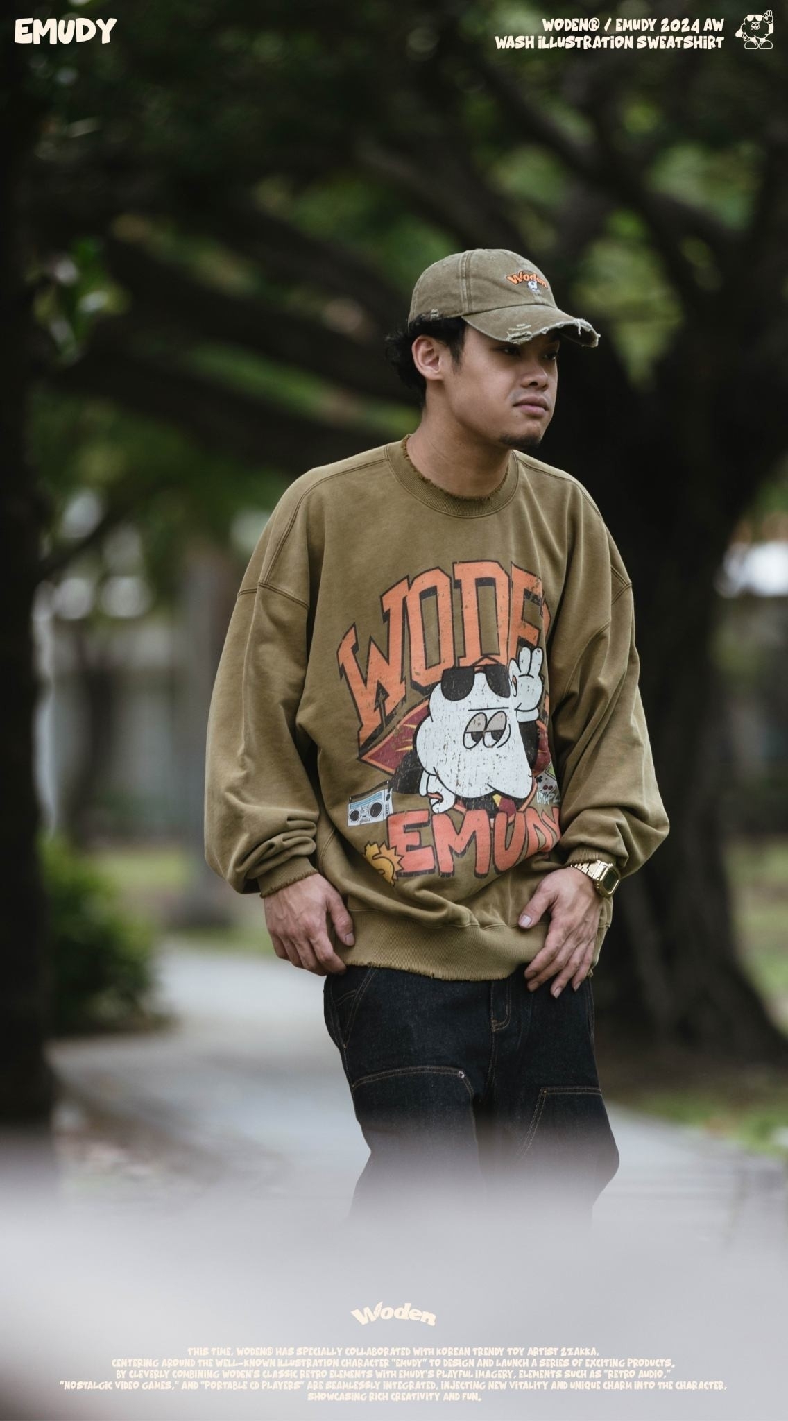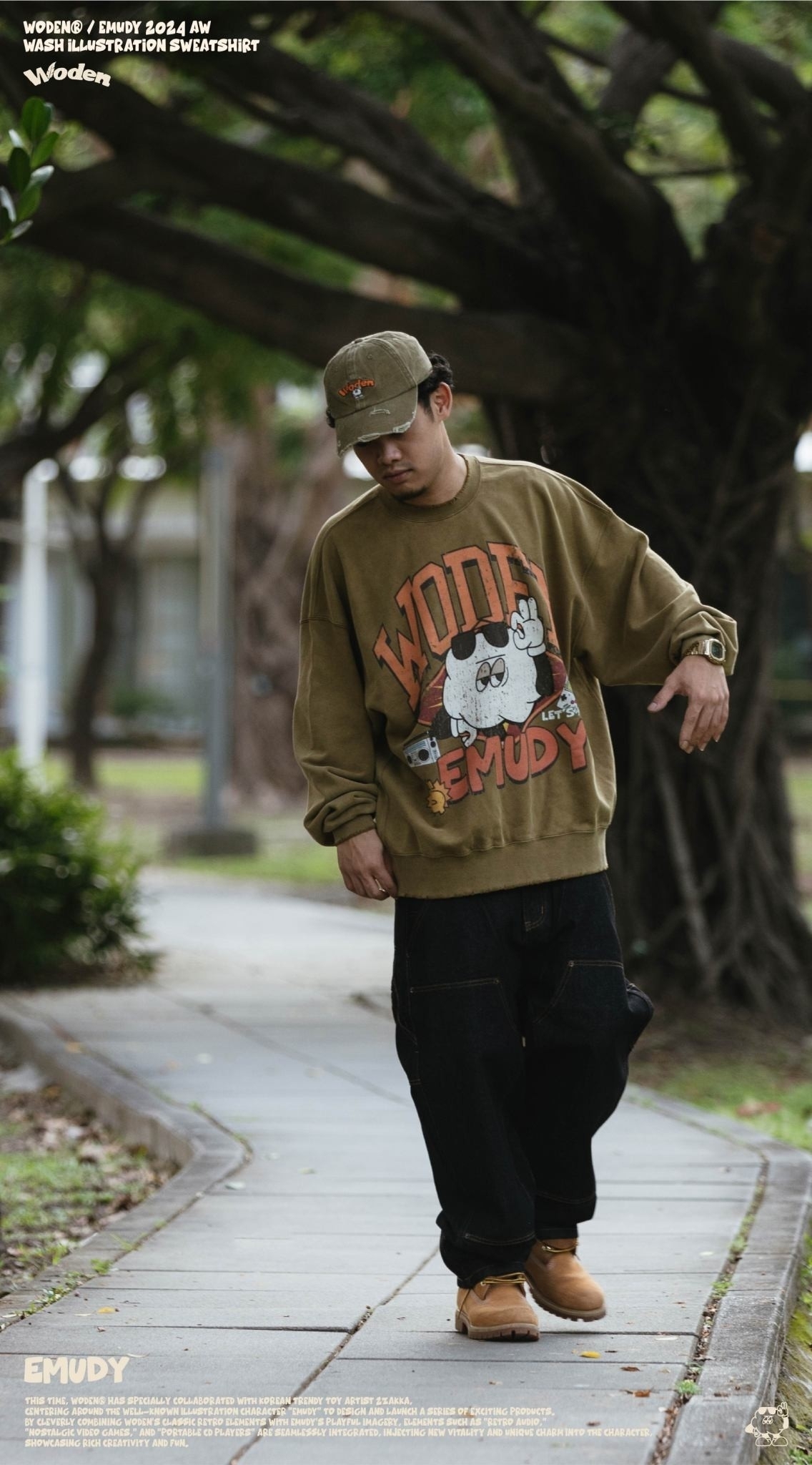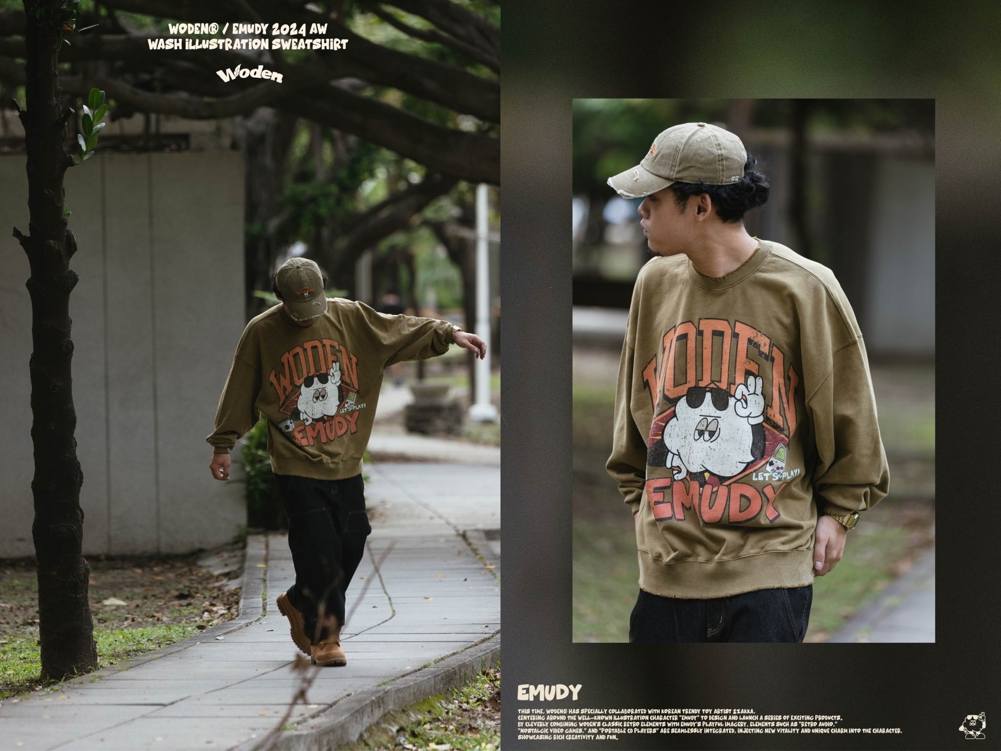 這款大學Tee 採用休閒寬短版型,正面設計靈感來自 90 年代的大圖像風格,將 WODEN 美式字體與 Emudy 雲朵角色巧妙結合於美式廣告單排版中,並透過特殊破壞印刷技術呈現,搭配整件洗水做舊效果,營造出濃厚的復古質感。