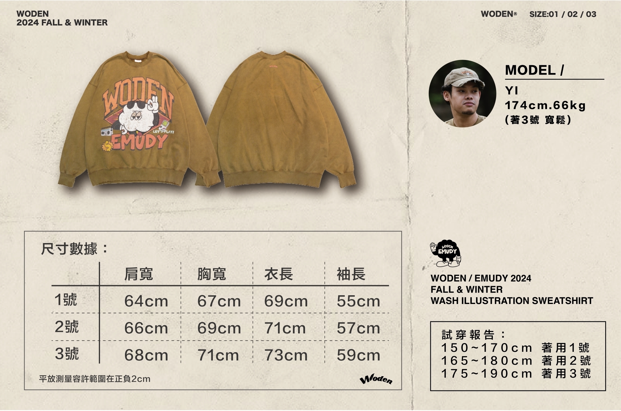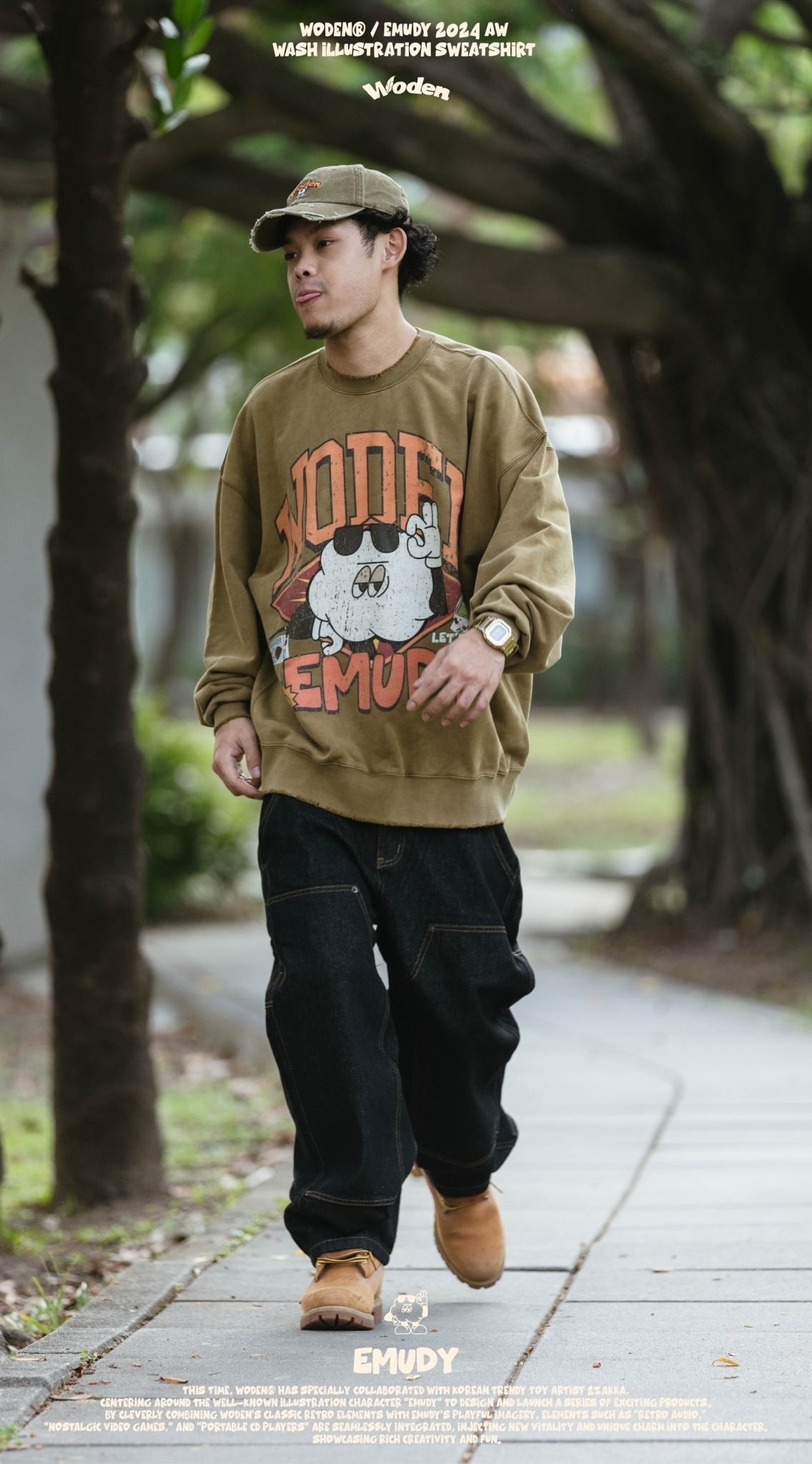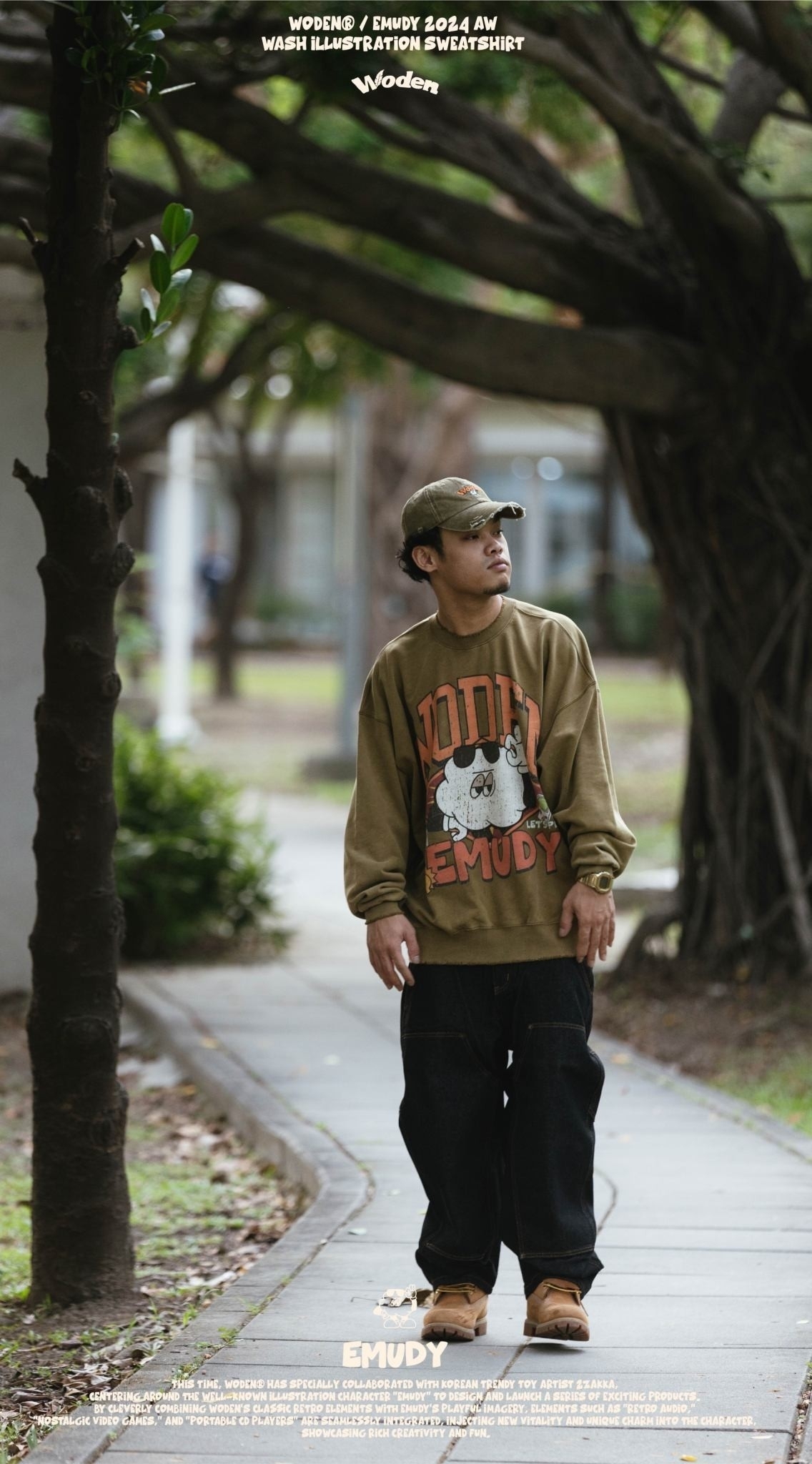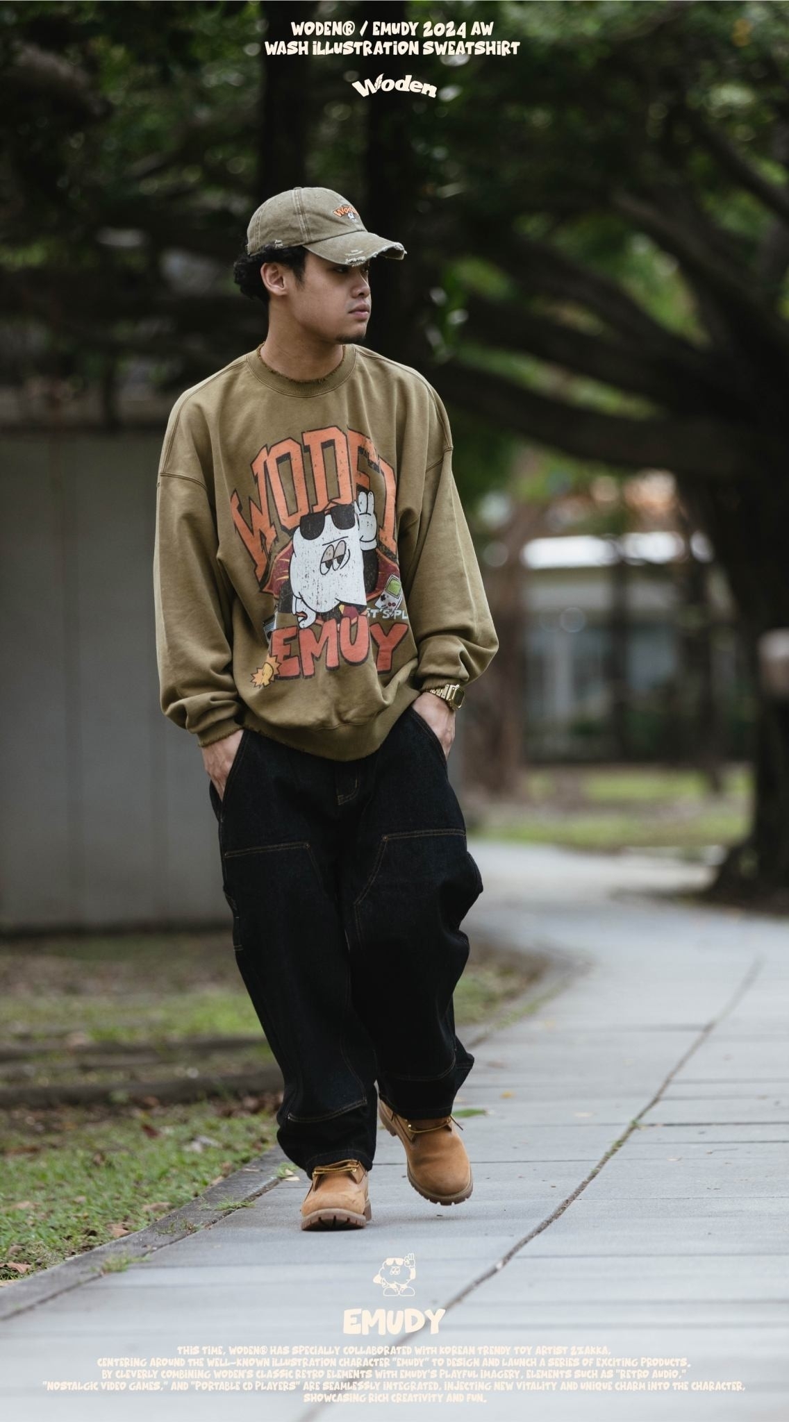 這款大學Tee 採用休閒寬短版型,正面設計靈感來自 90 年代的大圖像風格,將 WODEN 美式字體與 Emudy 雲朵角色巧妙結合於美式廣告單排版中,並透過特殊破壞印刷技術呈現,搭配整件洗水做舊效果,營造出濃厚的復古質感。