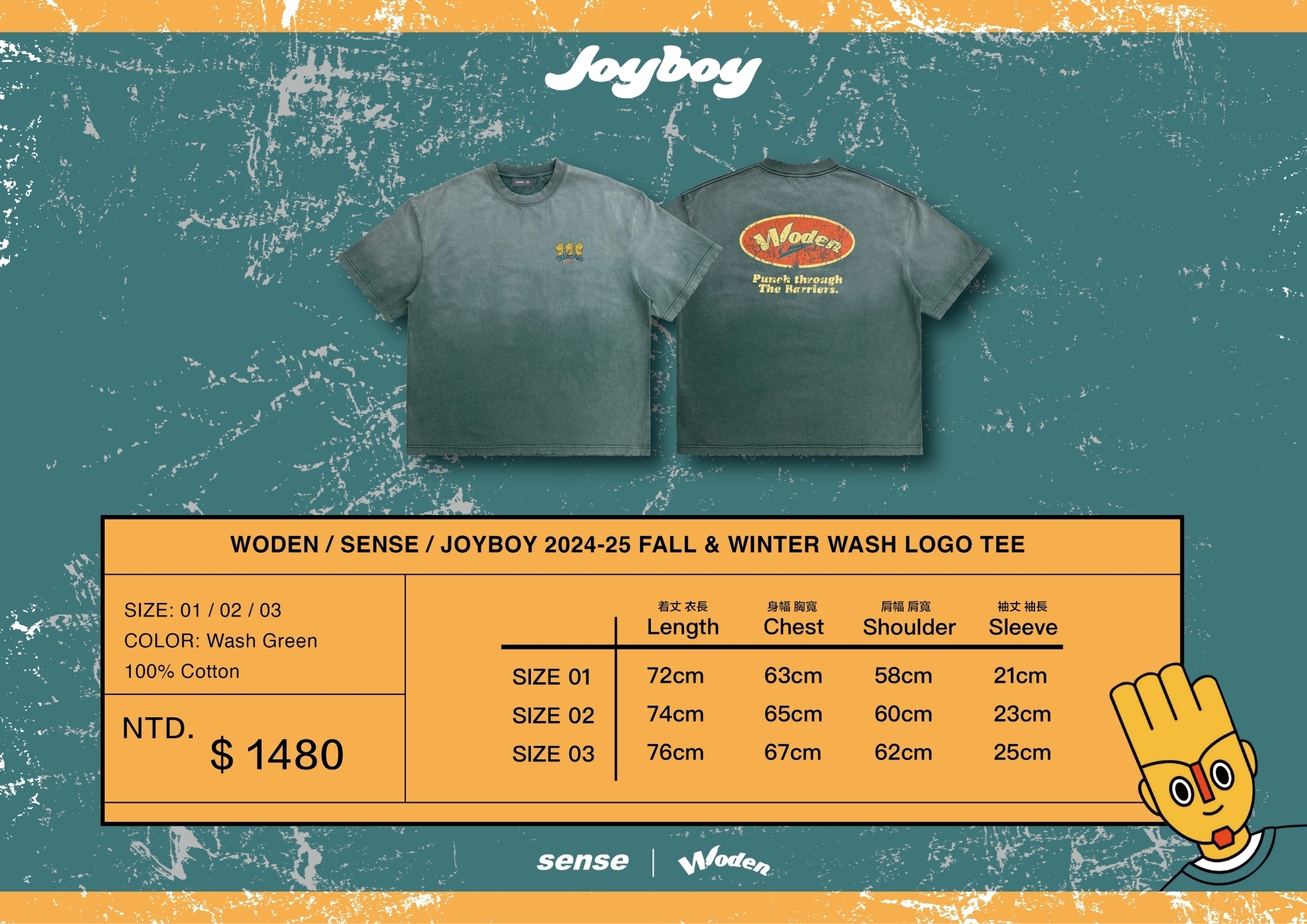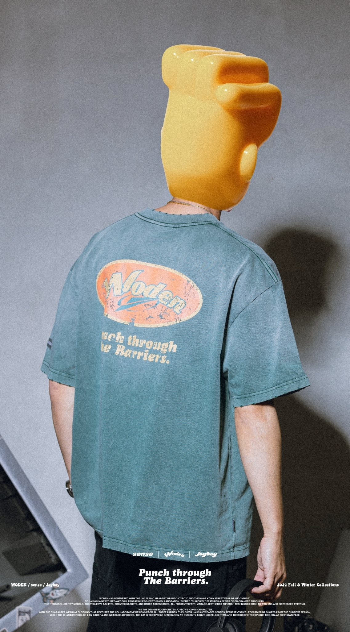 T-shirt正面左胸以Joyboy的角色頭像為設計主體,巧妙融合WODEN和sense的LOGO,提升辨識度。背面則以大面積LOGO搭配排版呈現,並運用破壞印刷手法,使圖像呈現仿舊落漆效果,完美傳達復古感。