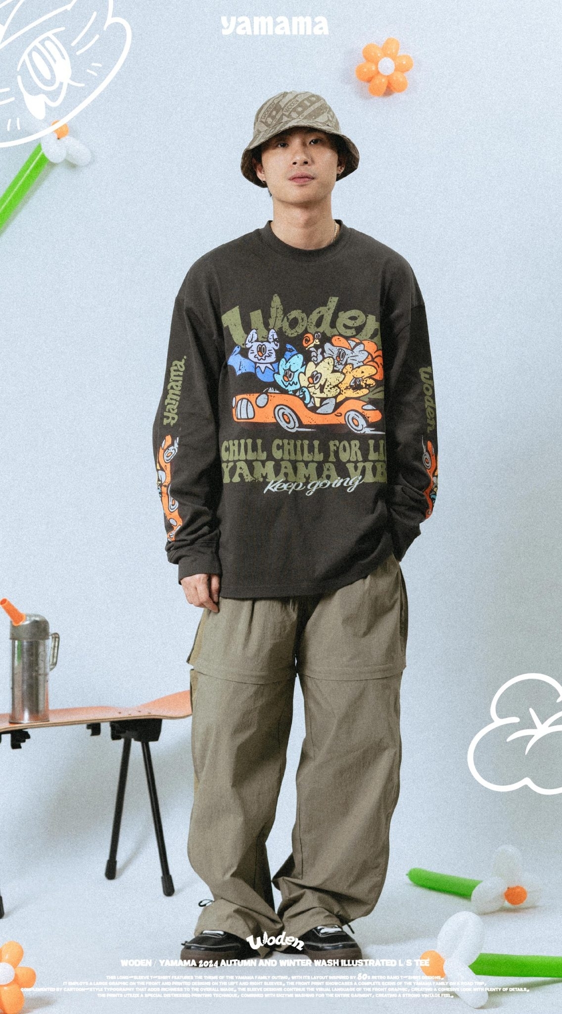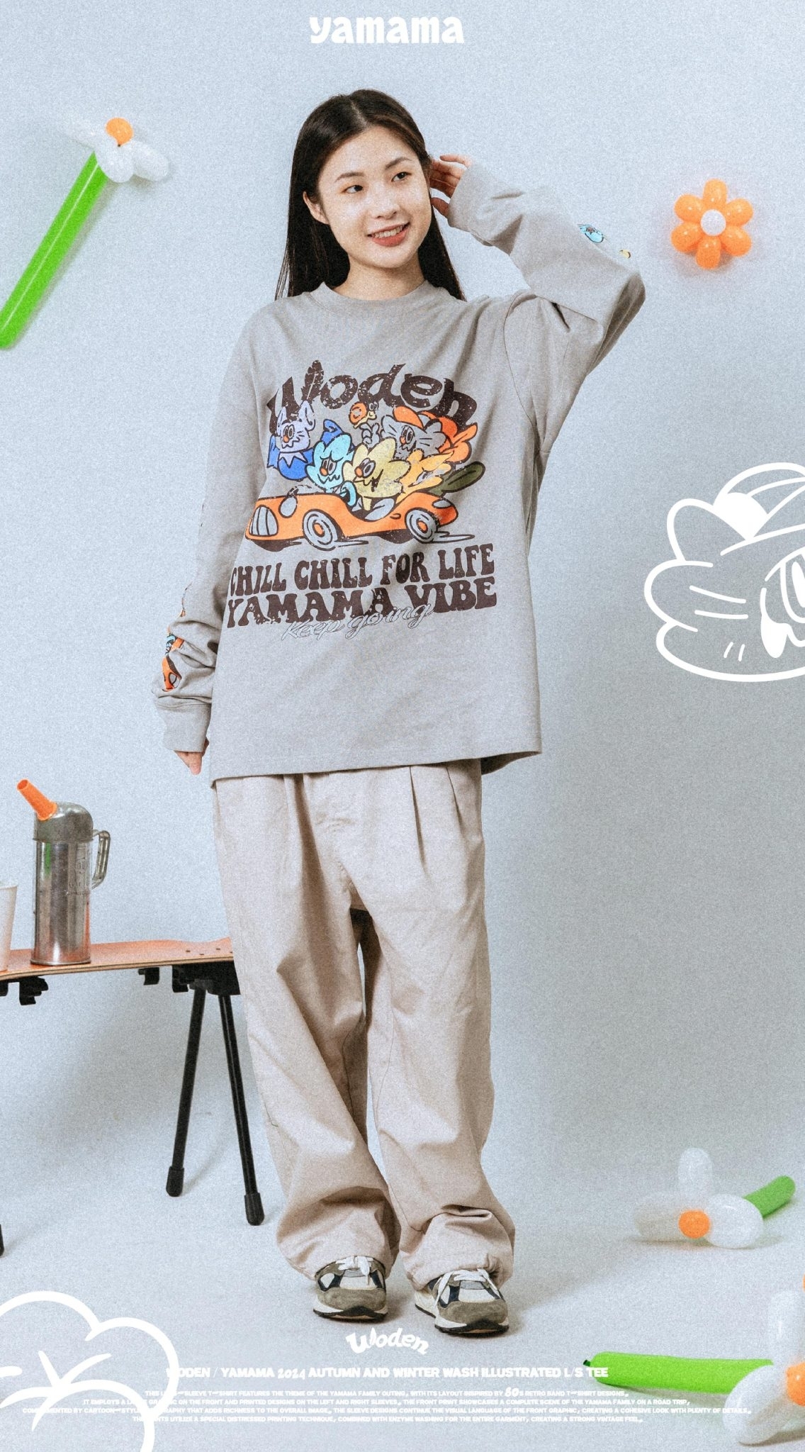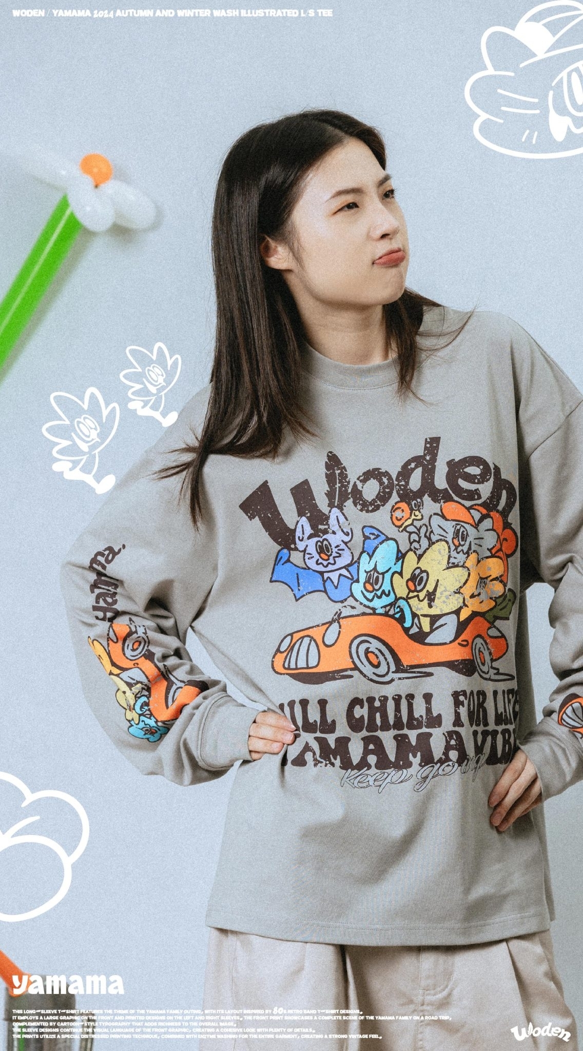 這款長袖 T-shirt 以 YAMAMA 家族出遊 為主題,排版靈感來自 80 年代復古樂團 T-shirt 設計,採用正面大圖與左右手袖印花的設計手法。正面印花呈現 YAMAMA 家族開車出遊的完整畫面,搭配卡通字樣排版,增添整體圖像的豐富性。手袖部分則延續正面畫面的視覺語言,左右相互呼應,細節滿滿。印花採用特殊的破壞印刷技術,搭配整件酵素洗處理,營造濃厚的復古質感。