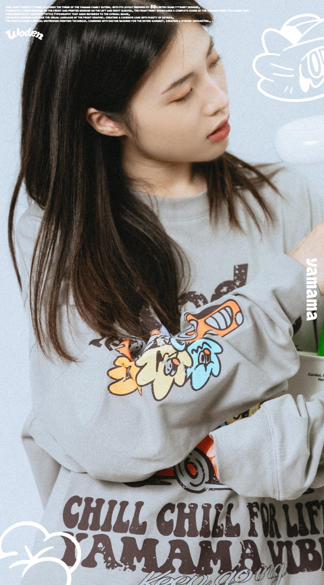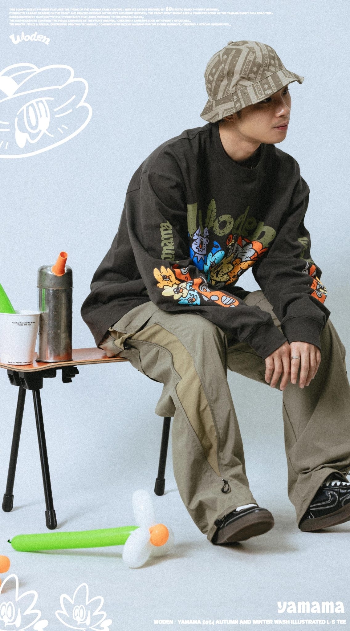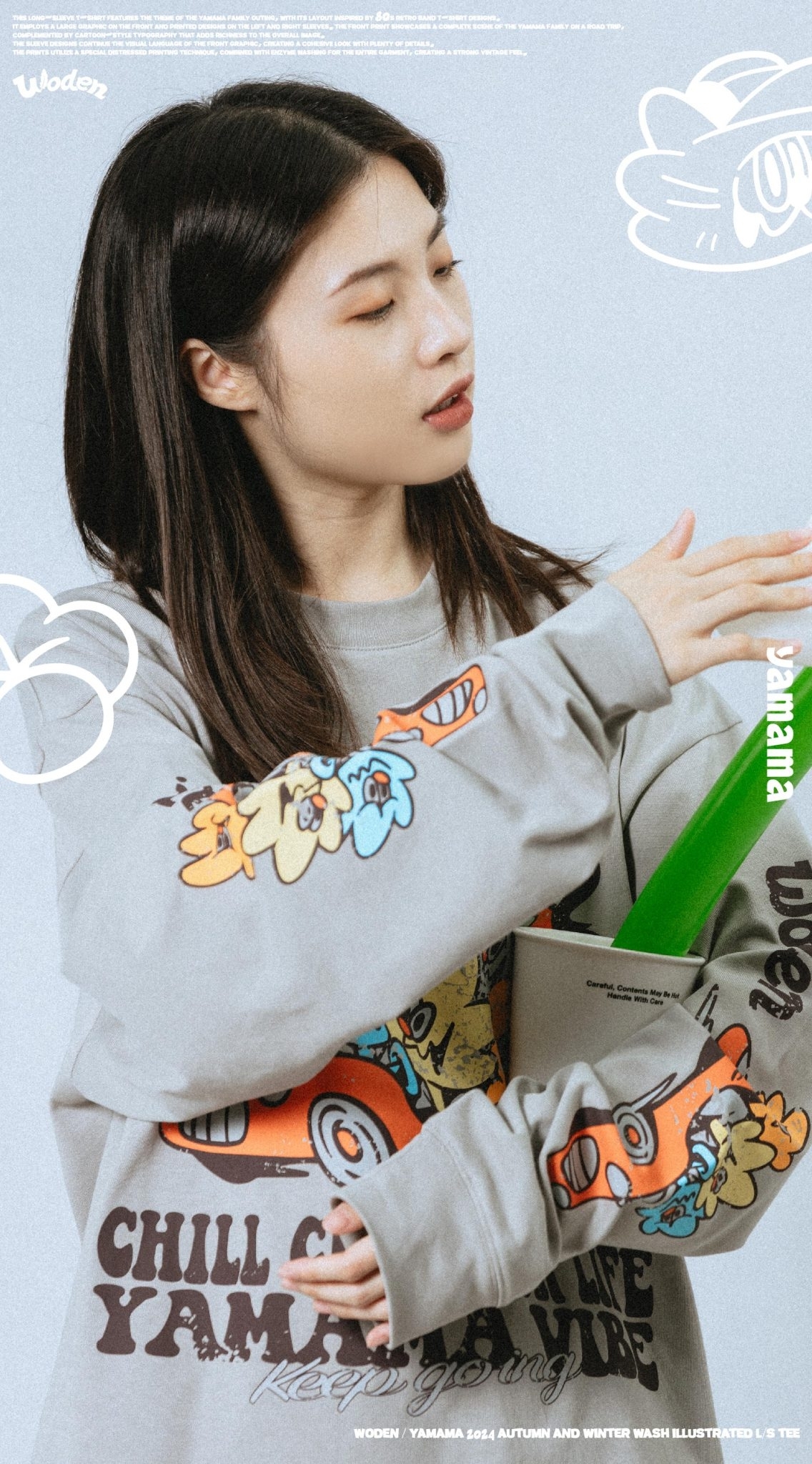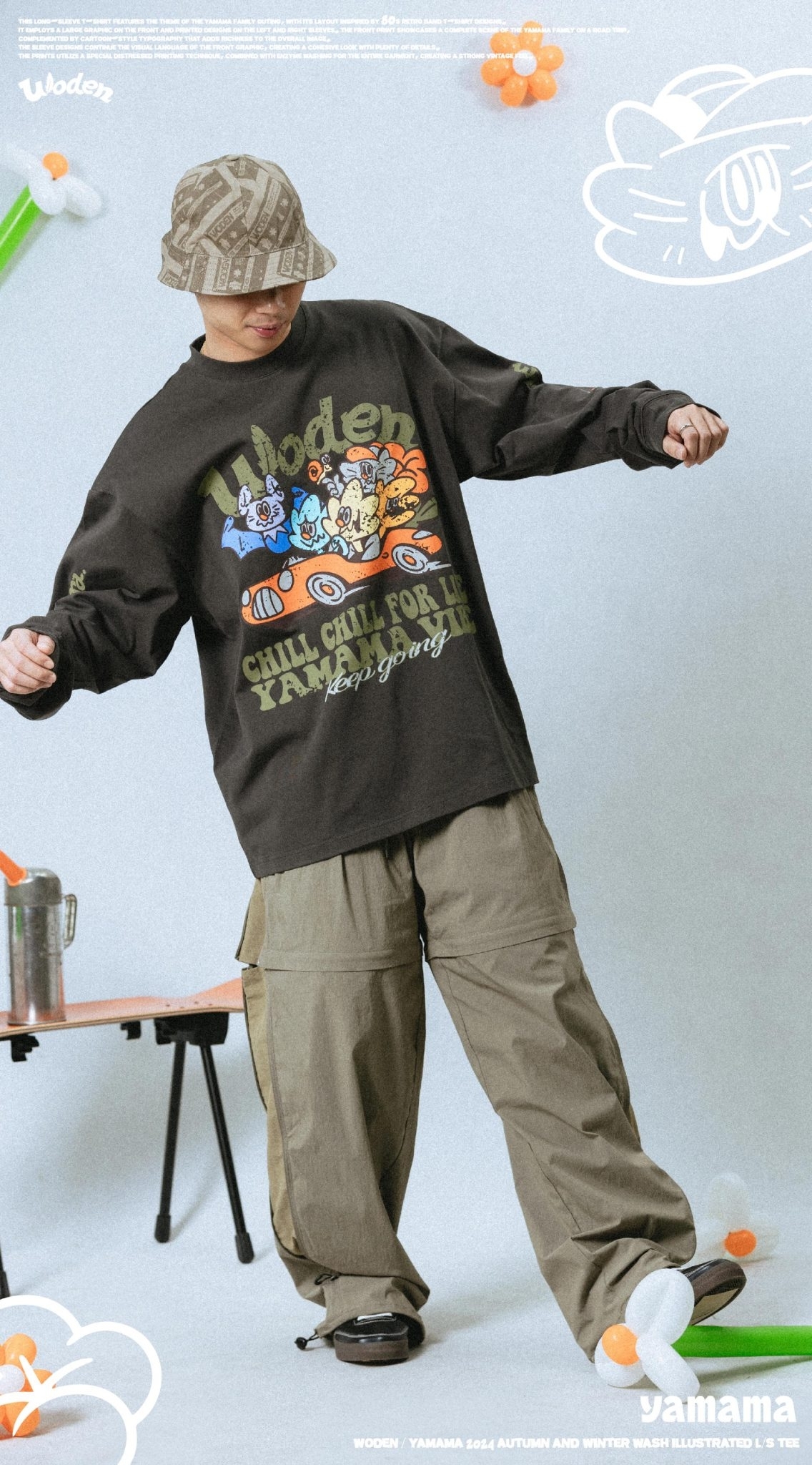這款長袖 T-shirt 以 YAMAMA 家族出遊 為主題,排版靈感來自 80 年代復古樂團 T-shirt 設計,採用正面大圖與左右手袖印花的設計手法。正面印花呈現 YAMAMA 家族開車出遊的完整畫面,搭配卡通字樣排版,增添整體圖像的豐富性。手袖部分則延續正面畫面的視覺語言,左右相互呼應,細節滿滿。印花採用特殊的破壞印刷技術,搭配整件酵素洗處理,營造濃厚的復古質感。